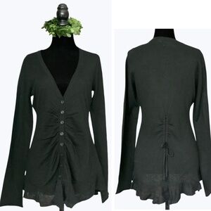 Anthropologie Button Trail black wool blend cardigan with gather front, drawstring back detail and knit ruffle flounced hem. Size medium.
