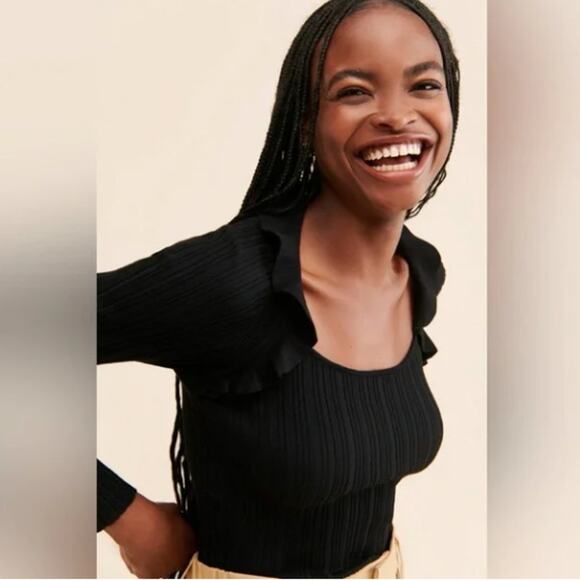 Elegant black crew neck sweater. Features ribbed texture and subtle ruffle detail. Perfect for versatile styling.