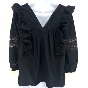 Anthropologie Black Double V Neck Ruffle Eyelet Peasant Boho Top Size XS