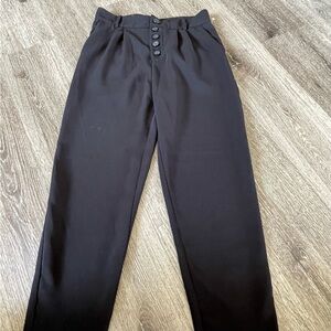 These elegant black dress pants from Anthropologie feature a comfortable elastic waistband and a relaxed straight leg fit. Crafted from a soft, stretchy material, they offer a sophisticated silhouette perfect for formal occasions. The full-length design ensures a polished look, making them a versatile addition to any wardrobe.