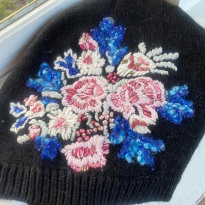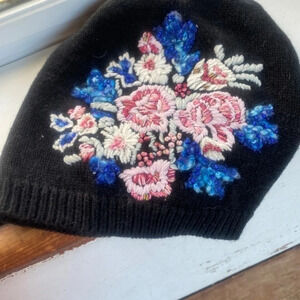 Anthropologie Black Embroidered Danielle Kroll Best Of Buds Wool Beanie