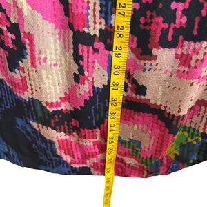 Add bold flair to your wardrobe with this vibrant Anthropologie dress in size Medium. Featuring a striking abstract floral print in pink, red, green, and cobalt on a black background, this lightweight dress offers a flattering silhouette with a surplice V-neckline, cap sleeves, elastic waist, and side pockets. The inner slip provides extra coverage and comfort.