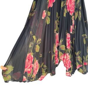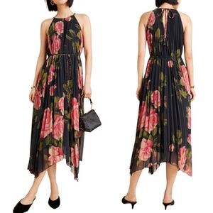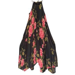 Anthropologie Black Floral Emeline Pleated Smocked Halter High Low Dress Small