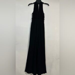 This sophisticated black jumpsuit by Anthropologie showcases a sleeveless halter neckline and wide-leg palazzo pants, creating an elegant silhouette. The cinched waist with a tie belt enhances the fit, while the keyhole back detail adds a stylish touch.