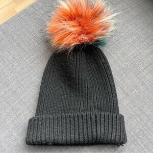 Anthropologie Black Knit Wool Blend Beanie with Multicolor Detachable Pom-Pom