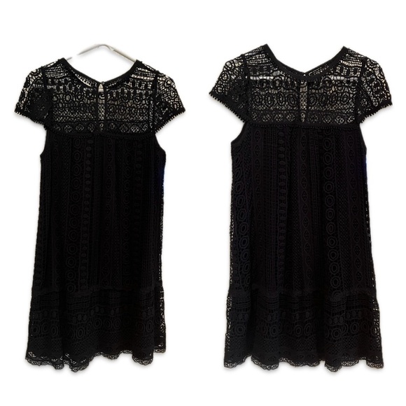 Chic black lace dress with intricate patterns. Perfect for formal occasions. Short sleeves and elegant design.