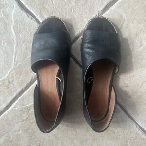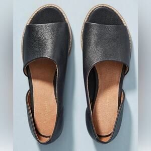 Comfy and versatile Anthropologie Souvenir Black Flats in size 6. Fit sizes 6-7 based on personal experience (I'm a 6.5-7). These stylish flats have an open toe and slip-on styling. Leather upper and insole. Rubber soles. Barely worn, in very good used condition. Light creasing on upper and soles show slight darkening. Great condition and super comfortable leather to walk in.