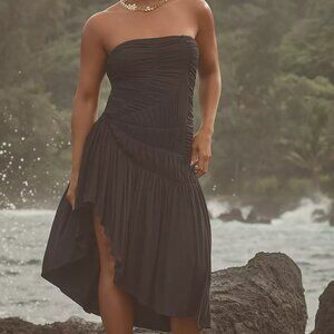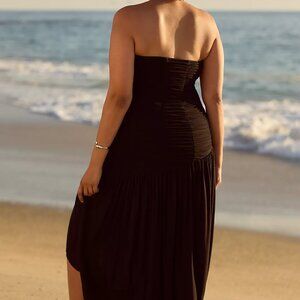 Elegant strapless midi dress. Asymmetrical hem. Perfect for evening wear.