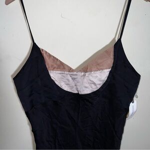 Elegant black mini dress. Features thin straps. Perfect for any occasion.