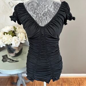 Elegant black ruched dress with a flattering V-neckline and short sleeves. Perfect for any occasion.