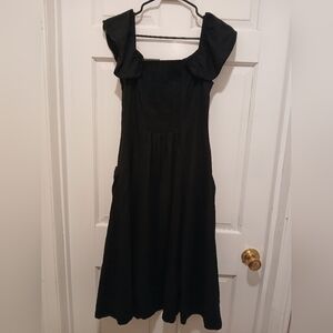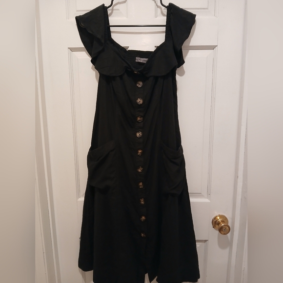Chic black strapless dress. Features button detail and pockets. Perfect for stylish outings.