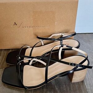 These brand-new-in-box black strappy block heels from Anthropologie are the perfect blend of style and comfort. Featuring a versatile design and a sturdy block heel, they provide support for all-day wear while still looking chic. The classic black color makes them easy to pair with everything from dresses and workwear to jeans for a more casual look.