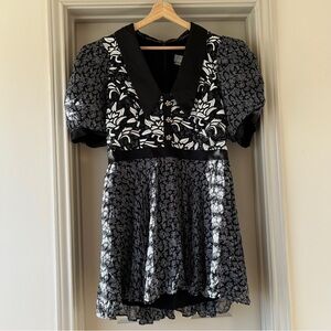 Brand new with tags! Anthropologie black and white embroidered dress in size 14. This stunning piece features intricate floral embroidery, a statement oversized collar, and puffed sleeves for an elegant, vintage-inspired silhouette. The dress has a flattering empire waist and flows into a breezy, lightweight skirt—perfect for any occasion, from weddings to dinner dates.