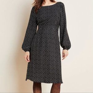 Worn Once. Darling & versatile polka dot and au courant puffed sleeve midi dress. Fully functional discreet side zip closure.