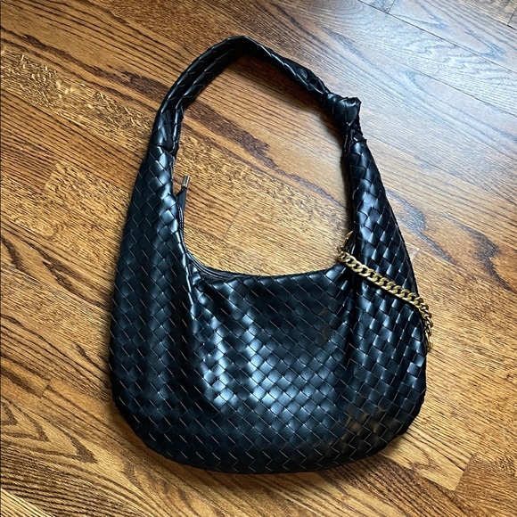 Chic black woven hobo bag with a gold chain detail. Ideal for versatile styling.