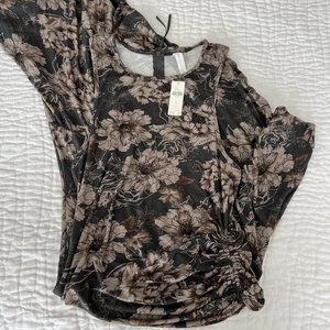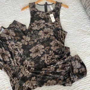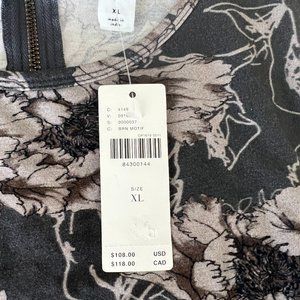 Elegant asymmetrical dress. Features a black and cream pattern. Perfect for any occasion.
