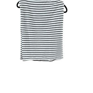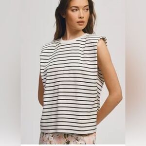 This sleeveless top from Anthropologie's Maeve collection features a relaxed, boxy silhouette with a classic black and white striped pattern. The muscle tee design has clean-cut armholes, making it a stylish and comfortable choice for warm weather.