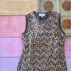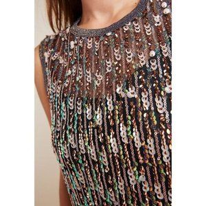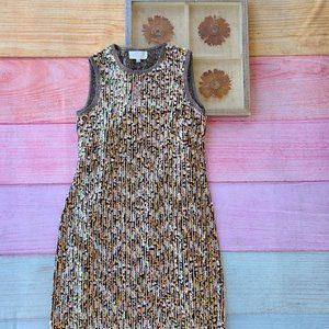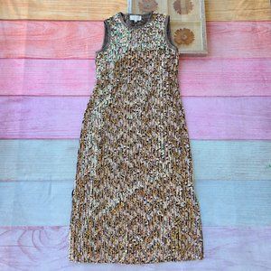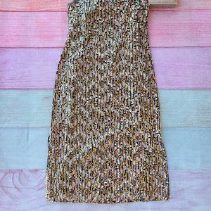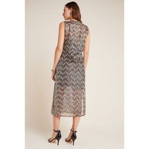 Elegant midi dress with a sleeveless design. Features a black and white pattern. Perfect for any occasion.