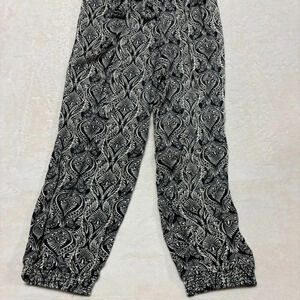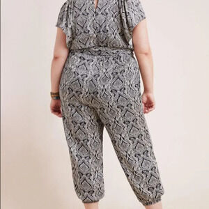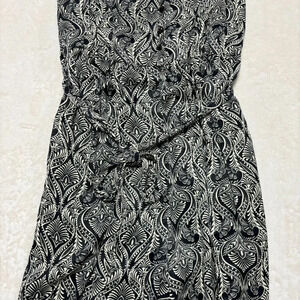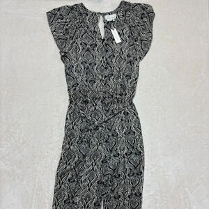 Stylish jumpsuit with intricate black and white pattern. Features short sleeves and a comfortable fit. Perfect for casual outings.