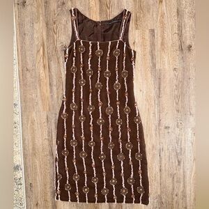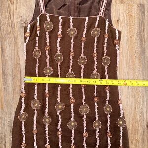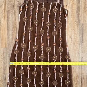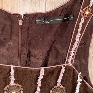 Size small. Made of silk and wool. Color is chocolate brown with light pink 3D embellishment and floral embroidery. Fully lined.