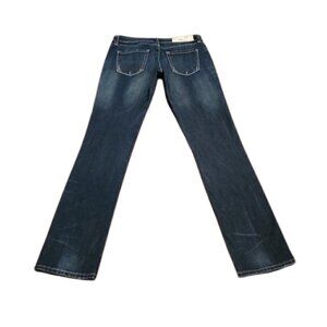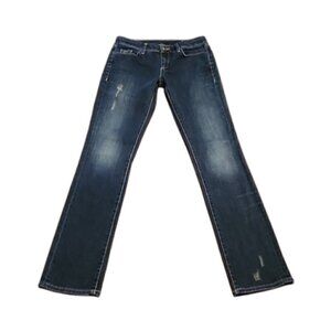 Dark rinse stonewashed straight bootcut jeans. Mid-rise. Single button and zipper front closure. Distressed detail. Whiskering accents. Sanded detail. Five pockets.
