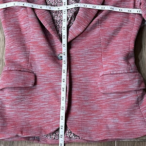 This is a pre-owned Anthropologie Cartonnier women's blazer in size S. It is made of a blend of 50% polyester and 50% cotton, with a 100% rayon contrast and a 100% cotton lining. The blazer is a pink and white color with a textured, slightly stretchy fabric. It features a single button closure, two front pockets, and long sleeves. The blazer is in good condition with no visible rips or tears.