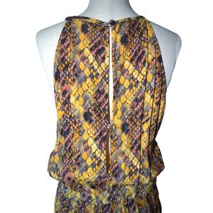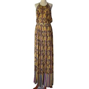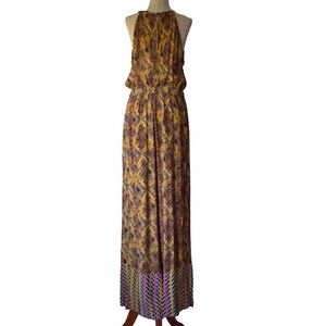 Eye-catching style with the Anthropologie Bl-nk Gallery Row Jumpsuit in a stunning brown motif. perfect for casual, fun, and flirty occasions. Its unique design and luxurious fabric make it a must-have addition to your wardrobe. Get ready to turn heads with this hard-to-find brown, deep yellow, orange motif jumpsuit! This sophisticated and fun jumpsuit features geometric and striped detailing at the top and bottom, adding visual interest and flair to your look.
