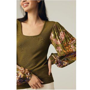 Bl-nk Printed-Sleeve Sweater Top from Anthropologie in the color "Green Motif".