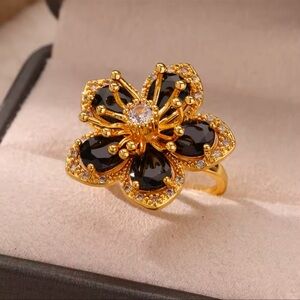 Anthropologie Blossom Black Floral Gold Adjustable Ring