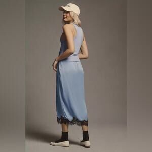 Elegant blue dress. Features black lace trim. Sleeveless design. Perfect for any occasion.