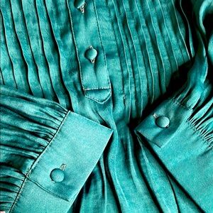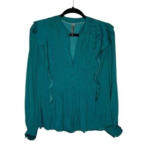This stylish blue blouse from Anthropologie showcases long sleeves with cuffed ends and delicate ruffled accents. Its elegant design is perfect for adding a touch of sophistication to any outfit.