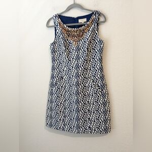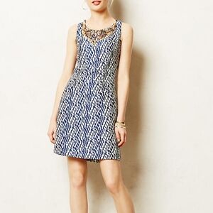 Anthropologie Blue Patterned Beaded Jacquard Sleeveless Shift Dress Office