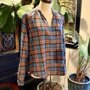 Anthropologie Blue Plaid Frayed Edging Popover top