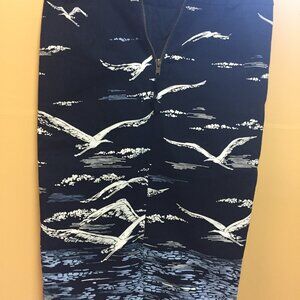 Navy blue skirt with seagulls fly over ocean. Back zipper and hook/clasp closure. Worn once like new condition, size 0 feels like xxs.