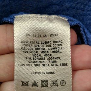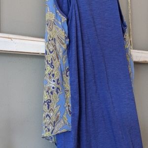 Stylish blue tank top with intricate cream patterns. Sleeveless design. Perfect for casual outings.