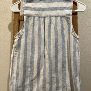 This elegant button-down shirt from Anthropologie features a classic blue and white stripe pattern, enhanced by a charming ruffled collar for a touch of vintage flair. Crafted from lightweight fabric, it offers a versatile style that can be effortlessly dressed up or down.