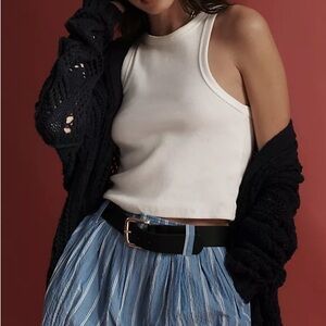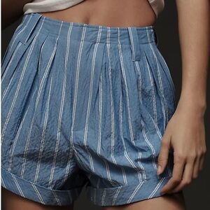 These high-waisted shorts from Anthropologie feature a chic blue and white color scheme with a stylish pleated design.