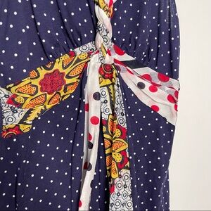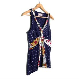 Excellent condition! Blue and white polka dot with nautical knot print and braided V-neckline tank top. Red, yellow, white, and blue fabric detailing.