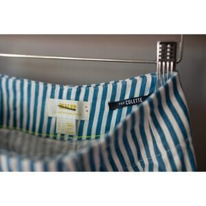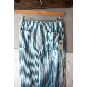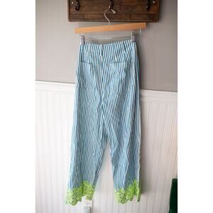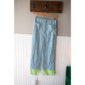 Stylish cropped pants with blue and white stripes. Features a unique green lace hem. Perfect for casual outings.