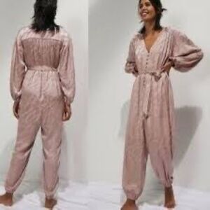 Anthropologie Blush Pink Satin Jacquard Button Front Jumpsuit Size Small