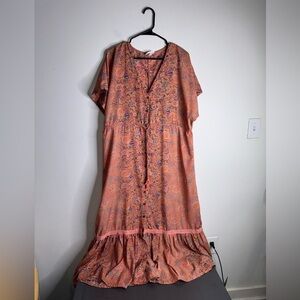 The dress is made of lightweight polyester, material with a rayon fabric type, Button tront Drawstring tassel waist, Ruffle hem Lace detail cocking the hem, Flutter sleeve, Maxi length, oversized dress
