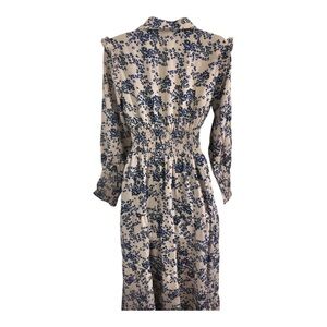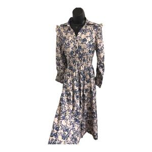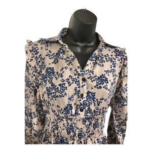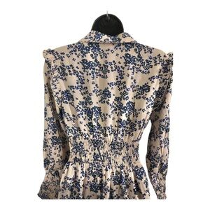Beomo beige blue floral ruffled shoulder smock waist button front maxi dress size small new
