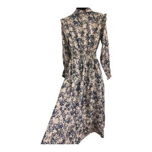 Stunning beige blue floral ruffled shoulder smock waist button front maxi prairie dress size small new