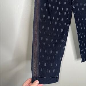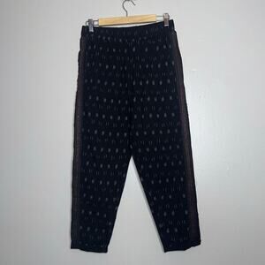 These Anthropologie boho‑style jogger pants feature a black‑and‑white patterned design with intricate brown beaded side stripes for a unique, statement look. Crafted from lightweight 100% cotton with a comfortable pull‑on elastic waist, they offer the perfect blend of relaxed style and effortless chic — ideal for casual weekends, festivals, or vacation wear.