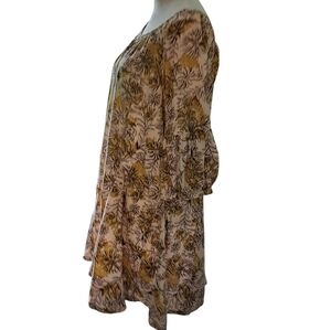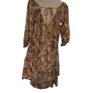Featuring a lightweight, flowy cotton fabric with warm yellow and brown tones, this dress is perfect for brunch, vacations, or festivals.