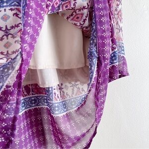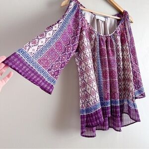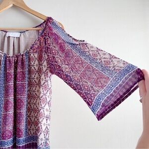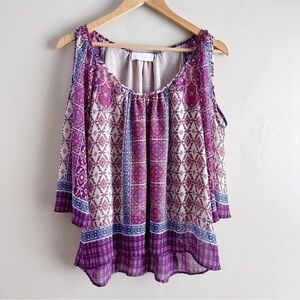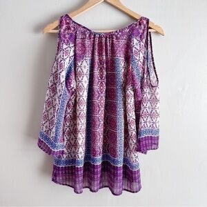 Anthropologie Braeve Boho Print Cold Shoulder Blouse in Purple/Pink/Cream, XS