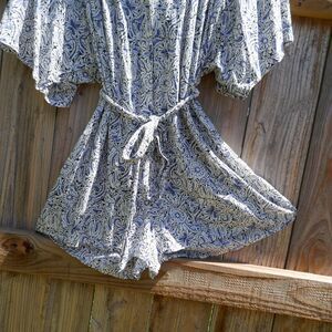 Anthropologie Breezy Lounge Romper. Short sleeve buttoned upper, relaxed fit shorts. Blue and white floral. Self-tie waist. Modal. Machine washable
