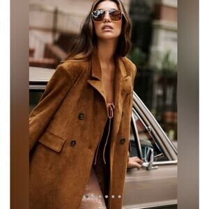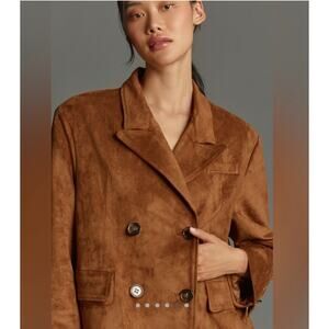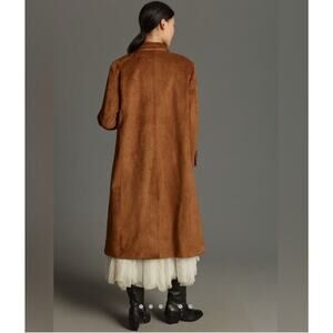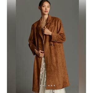 This sophisticated trench coat from Anthropologie features a timeless design in a warm brown hue. Crafted from a high-quality faux suede, it offers a relaxed fit that aligns with contemporary fashion trends. Ideal for fall and winter, this coat combines elegance with comfort.