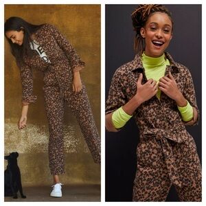 Bold leopard print jumpsuit by Anthropologie. Features a tie waist and long sleeves. Perfect blend of style and comfort.