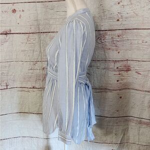 Light blue and white textured stripe button front long sleeve tunic with tie belt that can be worn two different ways. In very good condition.